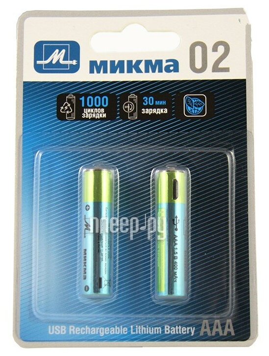 AAA - Микма 02 400mAh USB Rechargeable Lithium Battery (2 штуки) C183-26314 батарейки . информация: