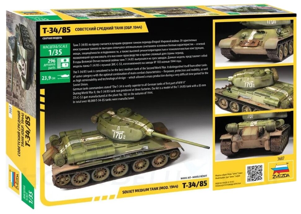 | Дополнительная информация | данная модель представляет собой модель танка Т-34/85 с пушкой 3I/IC-C-53, изготовленного на заводе № 183 осенью 1944 года; модель собирается при помощи специального клея, выпускаемого предприятием «Звезда», клей и краски продаются отдельно от набора; габариты упаковки 24 x 34 x 6 см, вес упаковки 0,48 кг |