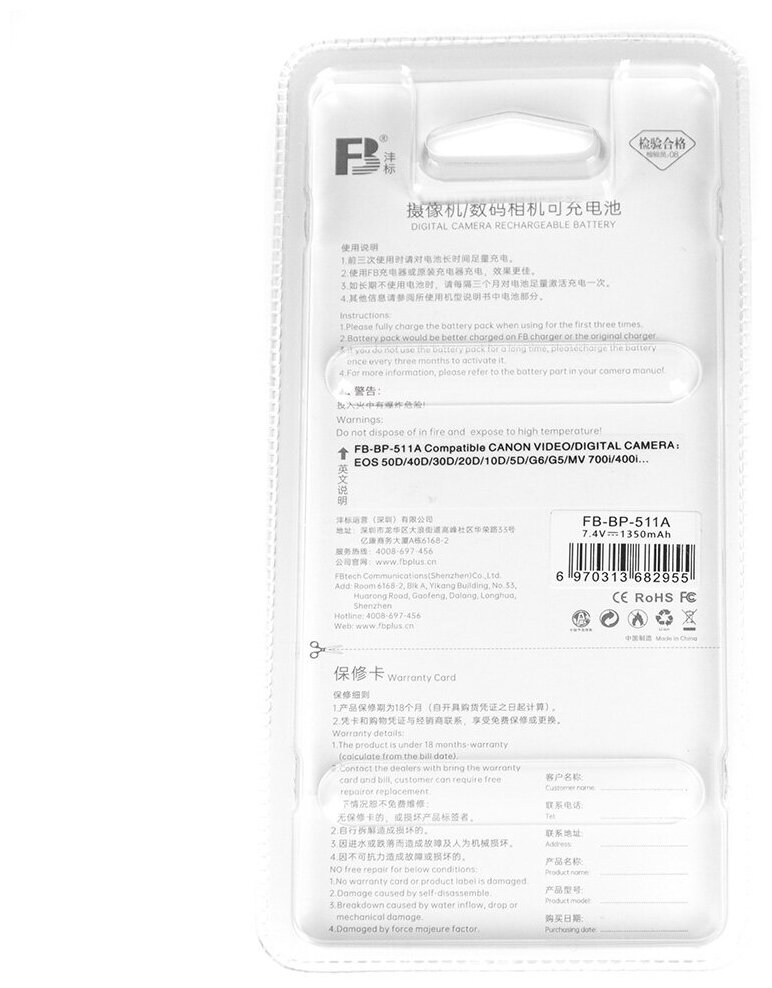Аккумулятор FB BP511A для Canon EOS 5D, 300D, 10D, 20D, 30D, 40D, 50D информация: