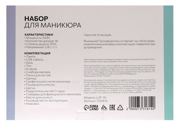Luazon Home Набор для маникюра LuazON, лампа LUF-19, 18 диодов, 54 W, инструменты, лаки информация: