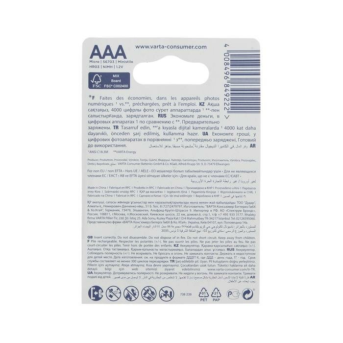 Varta Аккумулятор Varta, Ni-Mh, AAA, HR03-4BL, 1.2В, 800 мАч, блистер, 4 шт. информация: