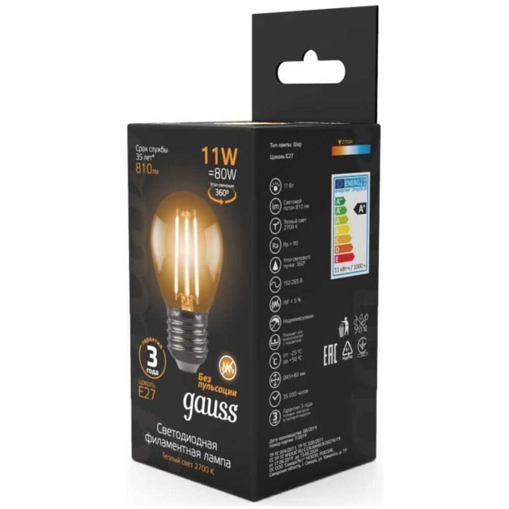 Светодиодная лампа Gauss LED Filament Шар E27 11W 720lm 2700K информация: