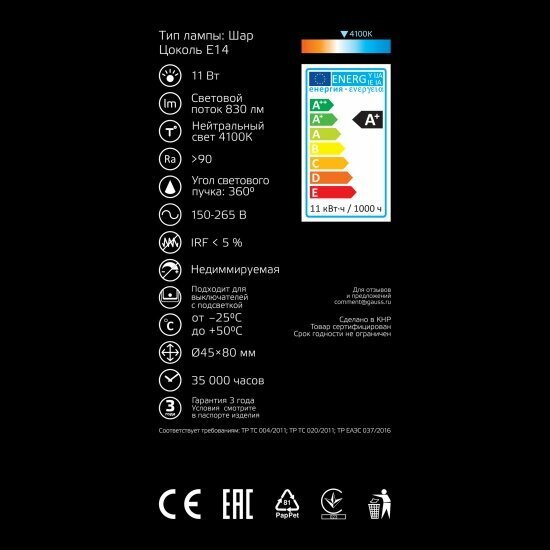 Светодиодная лампа Gauss LED Filament Шар E14 11W 750lm 4100K информация: