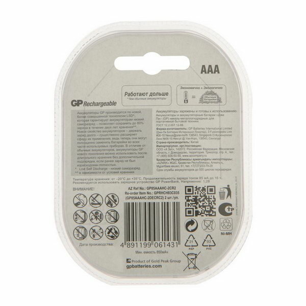 Отзывы на Аккумулятор GP, Ni-Mh, AAA, HR03-2BL, 1.2В, 850 мАч, блистер, 2 шт.