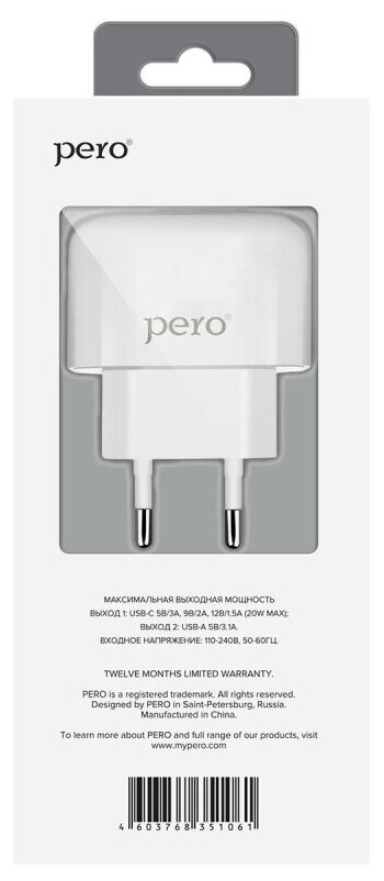 Сетевое зарядное устройство PERO TC10 USB-C 20W + USB-A, белый информация: