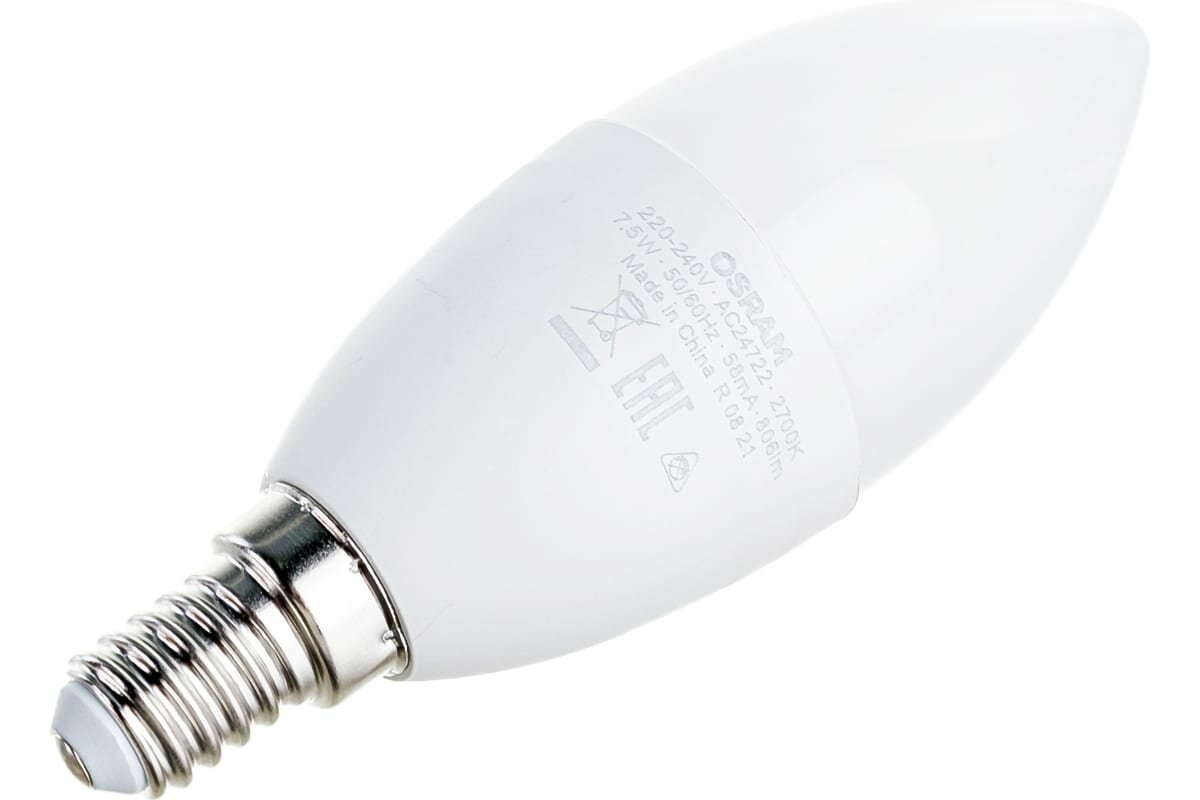 Лампа OSRAM LED Star E14 свеча B C37 8Вт, светодиодная LED, 806 лм, эквивалент 75Вт, тёплый свет 3000К