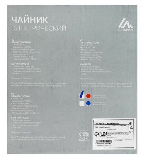 Luazon Home Чайник электрический Luazon LSK-1804, металл, 1.8 л, 1500 Вт, красный информация: