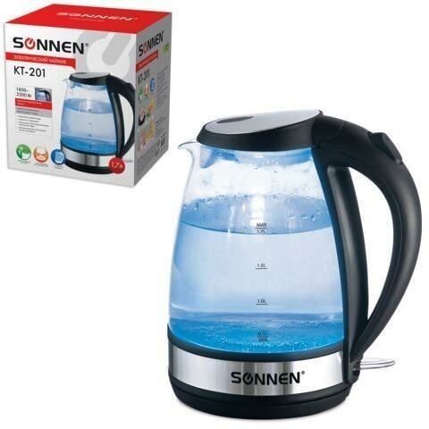 Чайник SONNEN KT-201, 1,7 л, 2200 Вт, закрытый нагревательный элемент, стекло, подсветка, черный, 451712, 1 шт