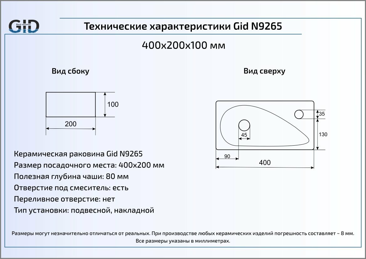 Раковина Gid N9265 накладная 40х20х10 белая 5 600 ₽
