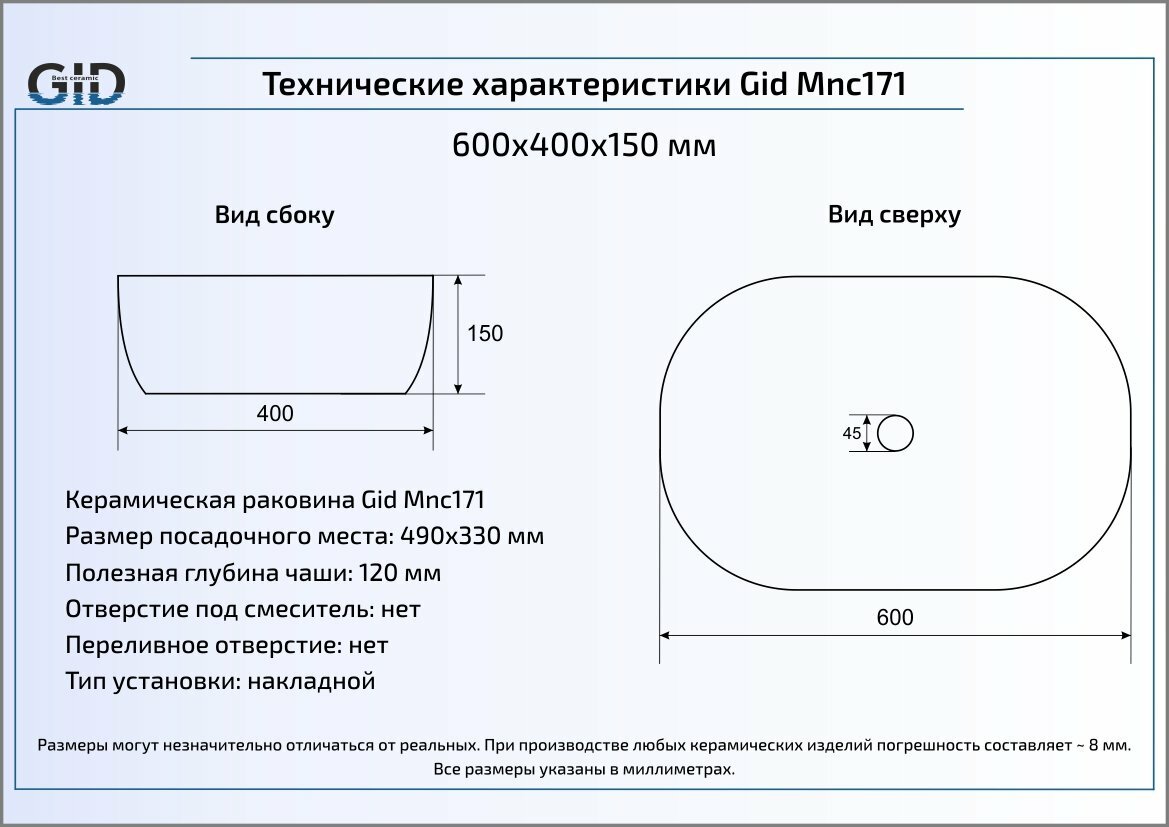 Накладная раковина для ванной Gid Mnc171 с донным клапаном