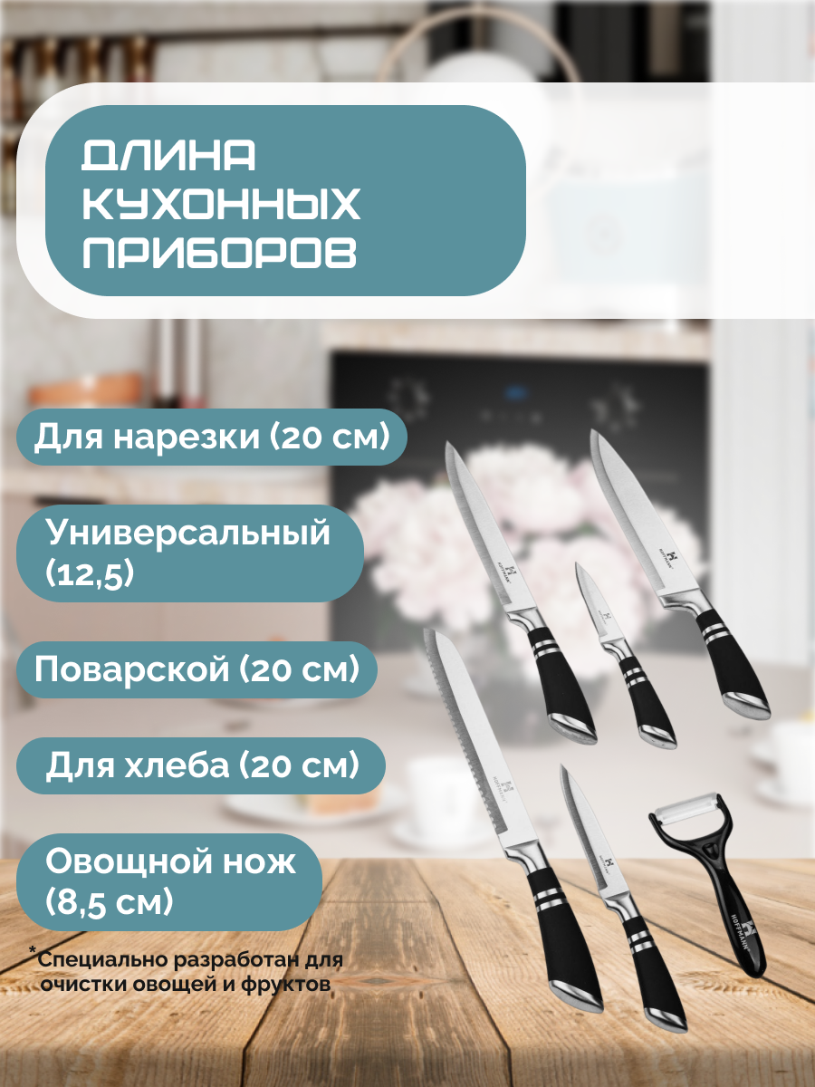 | Типы ножей в наборе | нож для овощей, нож для хлеба, универсальный нож, шеф-нож |