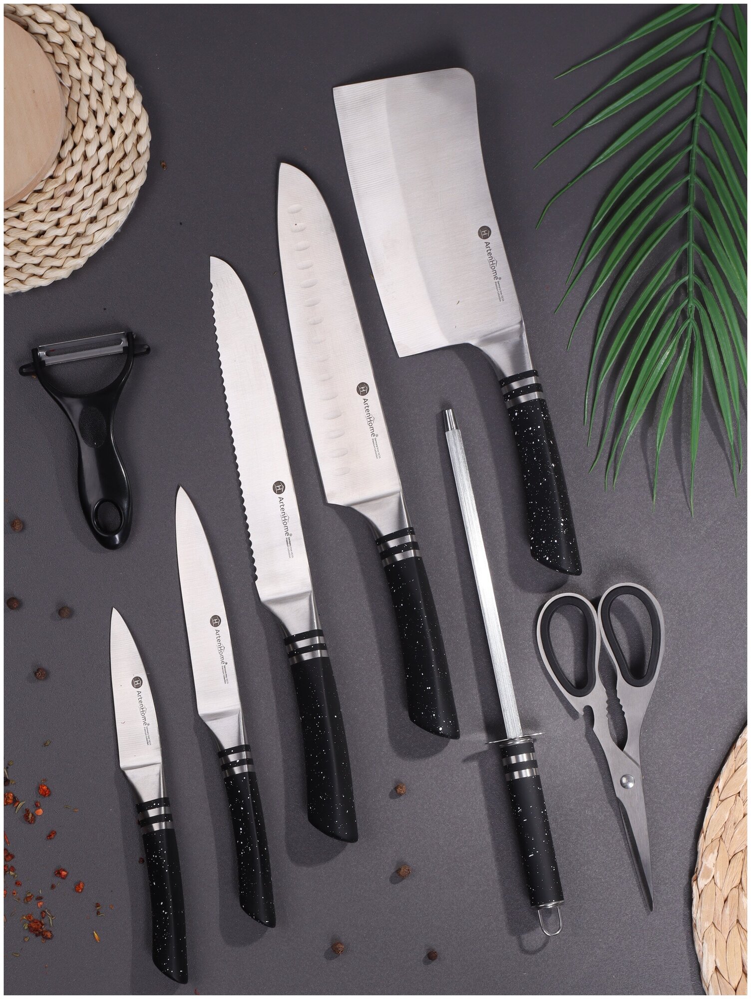 | Типы ножей в наборе | нож для пиццы, нож для овощей, универсальный нож, нож для хлеба, нож для сыра, разделочный нож, шеф-нож |