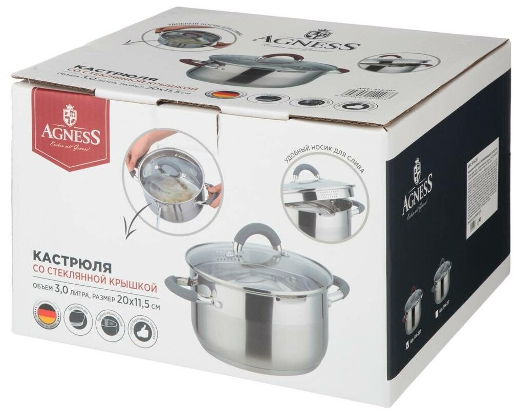 Кастрюля agness profi home со стеклянной крышкой, 3, 0л 20x11.5 см KSG-914-207
