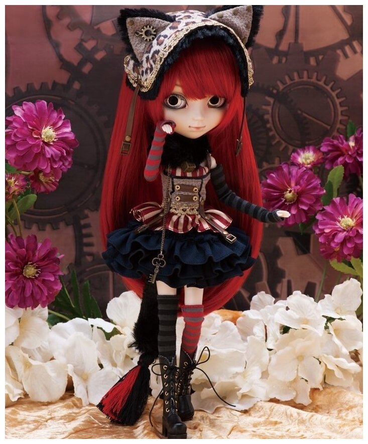 | Комплектация | Кукла Пуллип Чеширский Кот из мира стимпанк, головной убор, украшение-чокер, митенки, корсет, топ, юбка, штанишки, гетры, ботинки, подставка |