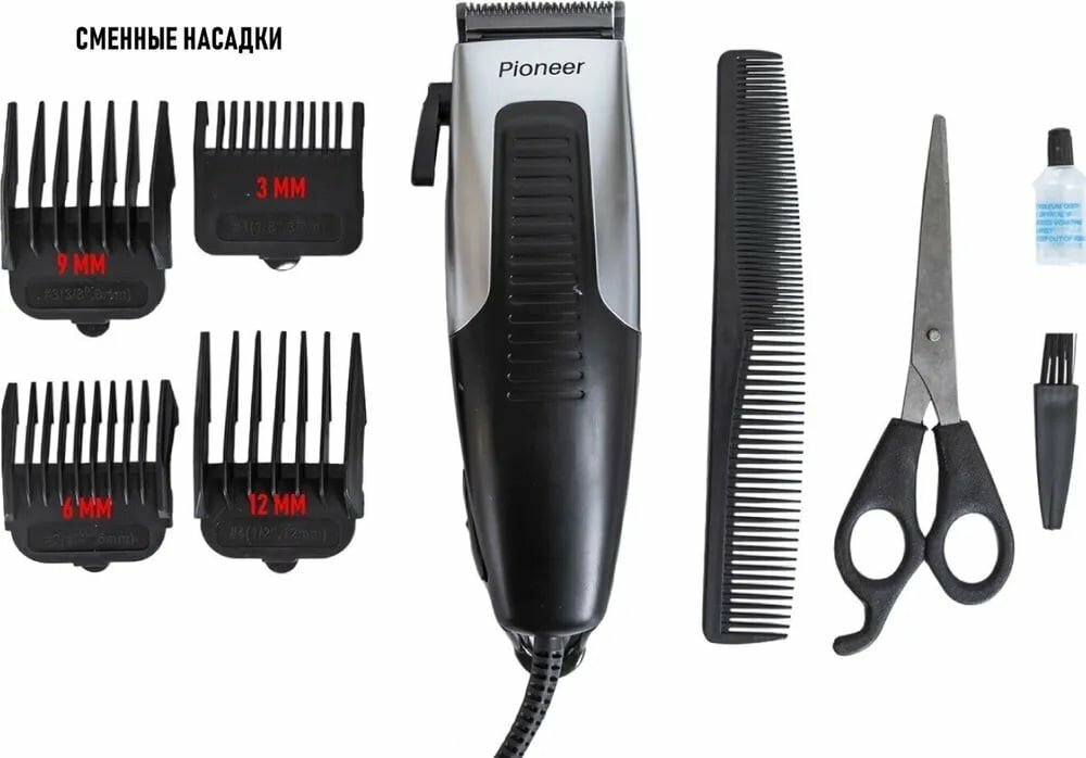 Машинка для стрижки Pioneer сетевая, стальные лезвия, с регулятором длины и насадками 3 мм, 6 мм, 9 мм, 12 мм, ножницы и расческа в комплекте, 10 Вт информация: