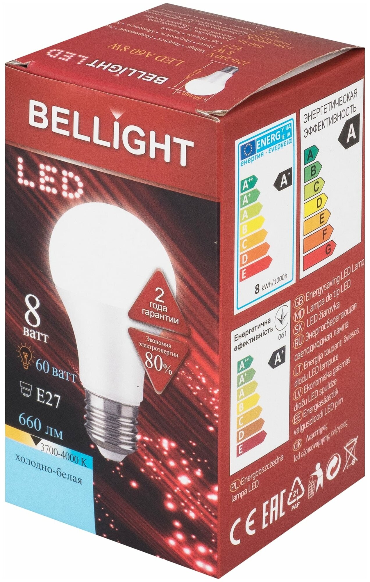 Лампа светодиодная A60 E27 220 В 8 Вт груша 660 лм, белый свет информация: