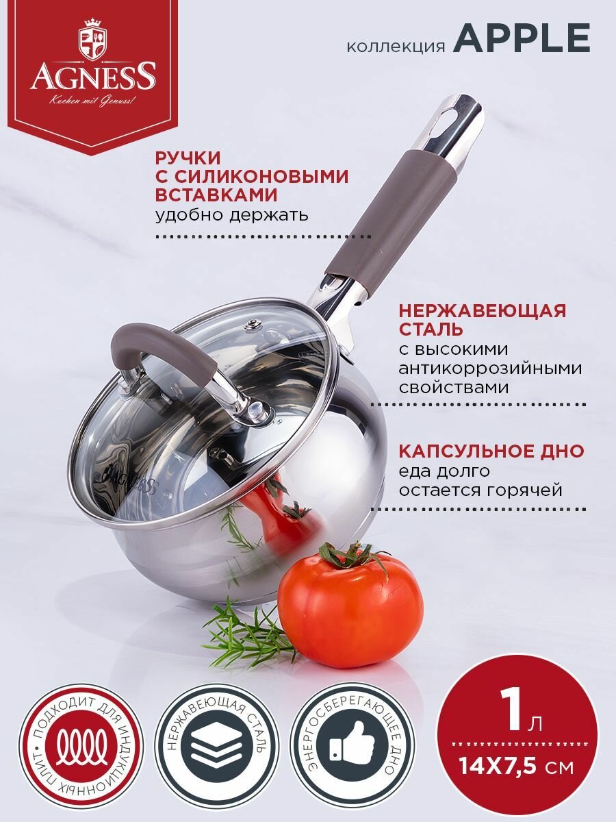 Ковш кухонный Agness со стеклянной крышкой, серия "Apple" 1 л., 14 х 7,5 см 1 508 ₽