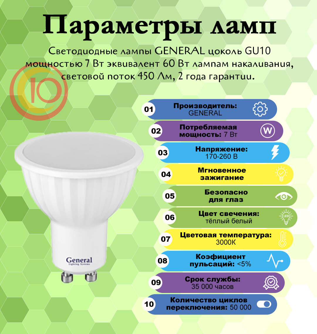 Отзывы на General, Лампа светодиодная, Комплект из 6 шт., 7 Вт, Цоколь GU10, 3000К, Форма лампы Круг
