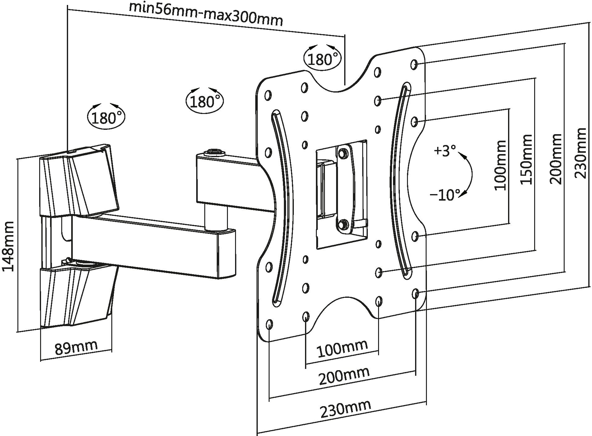 Кронштейн настенный Ultramounts UM899 для 23"-43" до 20кг, от стены 56-300мм, VESA 100x100,200x100,200x200, наклон до 10° и подъем до 3°, влево и впра