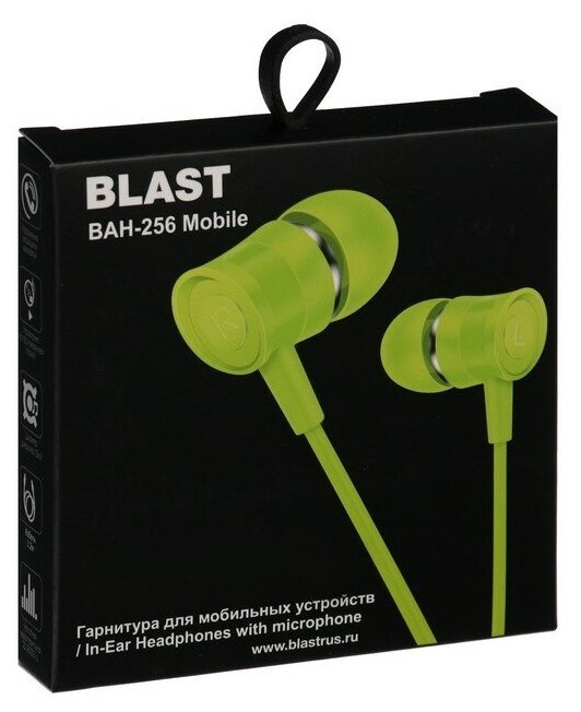Blast Наушники Blast BAH-256 Mobile, вакуумные, микрофон, управление, 32 Ом, 3.5мм, 1.2м, зеленые информация: