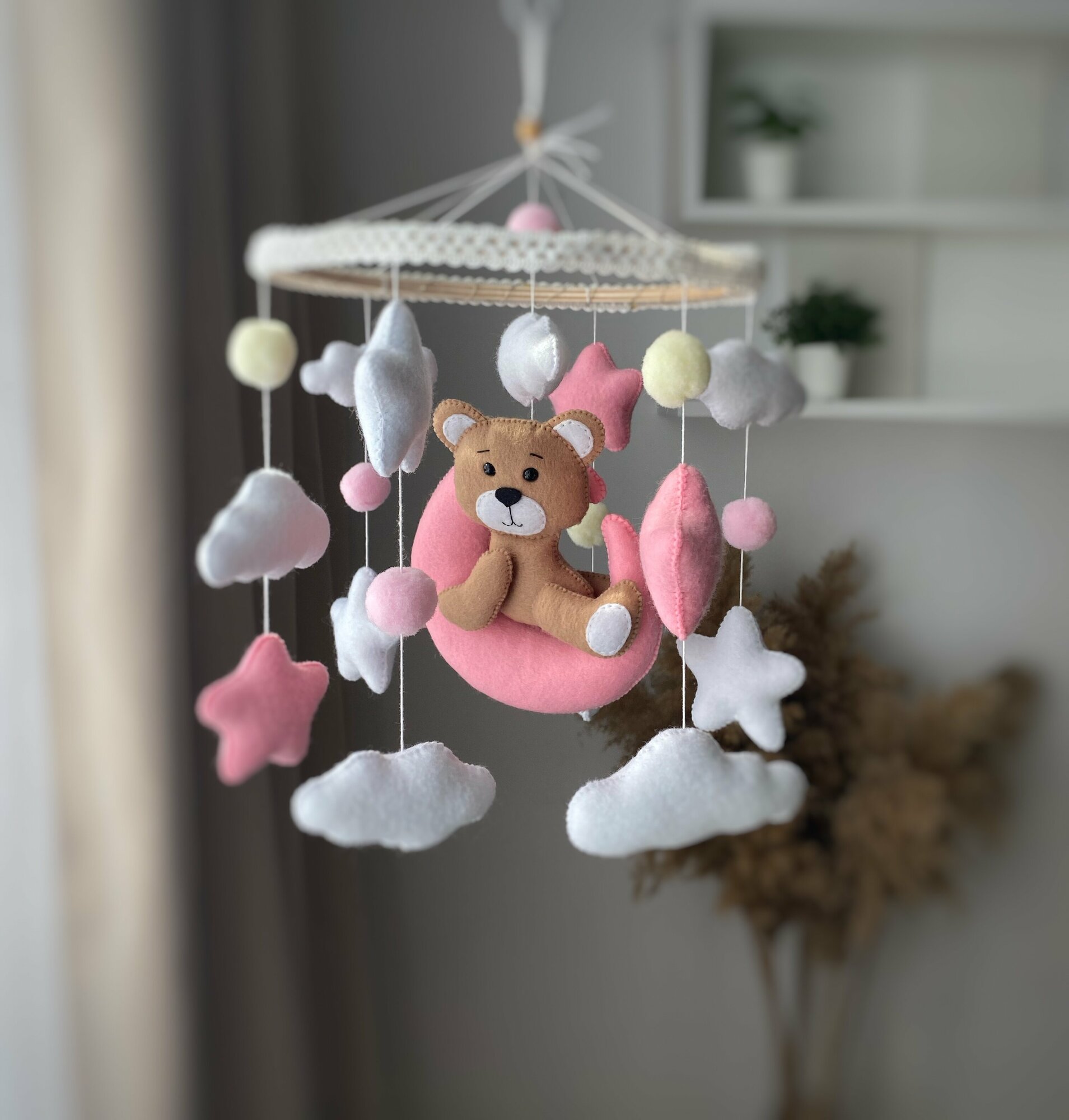 Мобиль на кроватку музыкальный для новорожденных и кронштейн из дерева-3