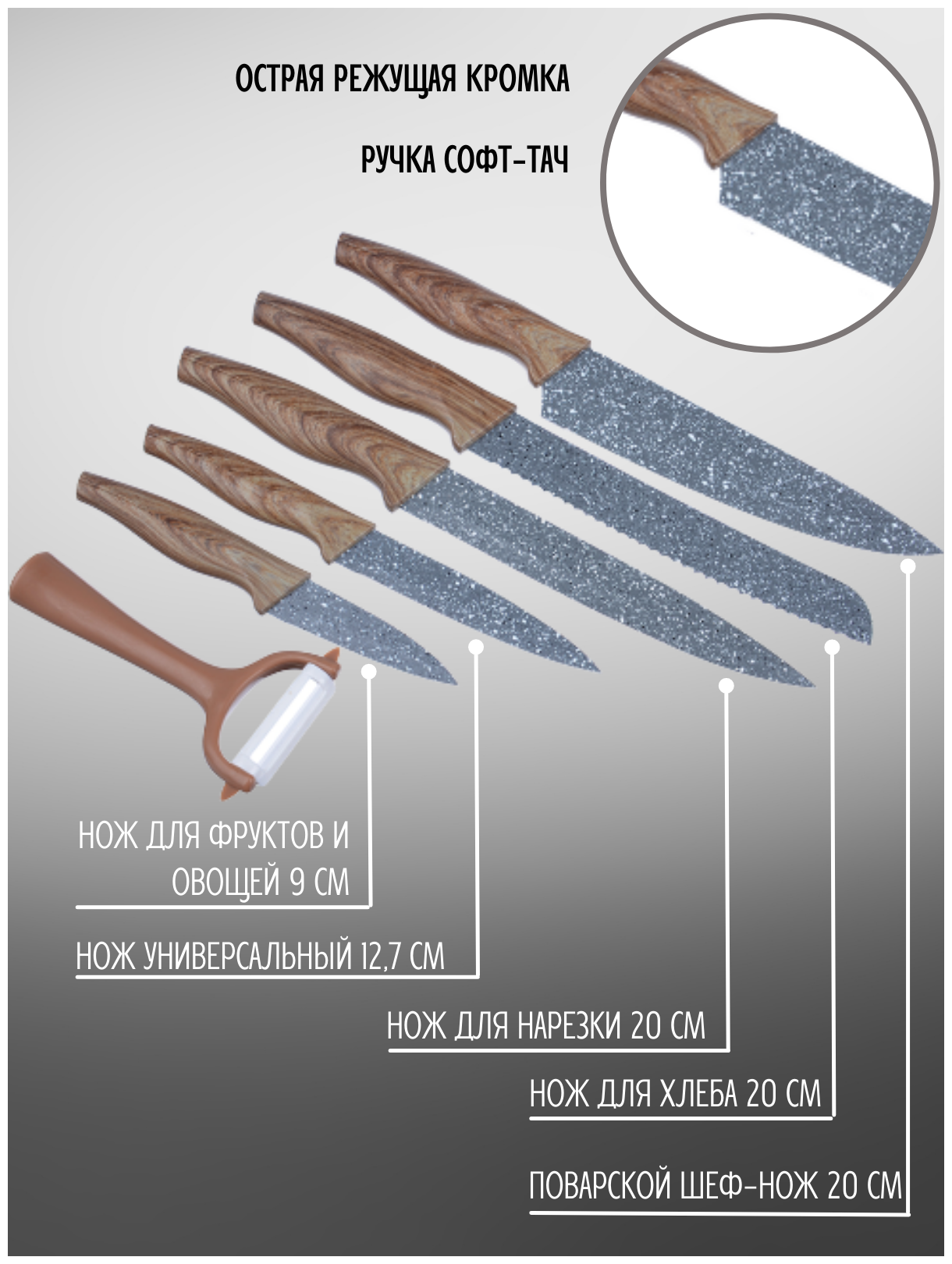 | Типы ножей в наборе | нож для овощей, нож для томатов, нож для хлеба, универсальный нож, шеф-нож |