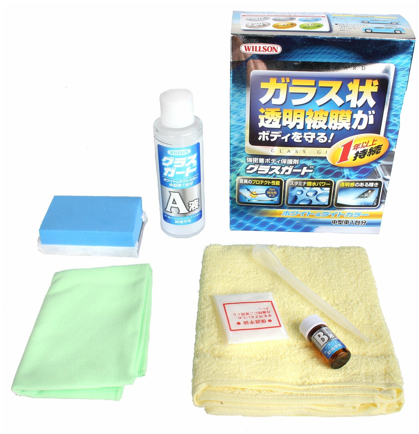 | Дополнительная информация | обьем - 110 мл (состав A) + 4,5 мл (состав B); структура - состав А - алкосилан, алкоксисилокан, изопарафин, нонан, диоксид кремния; состав B - органометаллический состав, 1-бутанол; расход средства - примерно 50 мл на 1 легковой автомобиль; сохранение защитных свойств - защита кузова - до 1 года, блеск и гидрофобность - до 6 месяцев; срок годности - 5 лет (дата изготовления указана на упаковке); сертификат - Willson Co. Ltd. 6-13, Saginomiya-1-Chome, Nakano-ku, Tokyo 165-0032 |