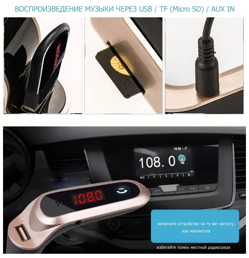 FM модулятор (ФМ трансмиттер) с Bluetooth / громкая связь / зарядное устройство автомобильное информация: