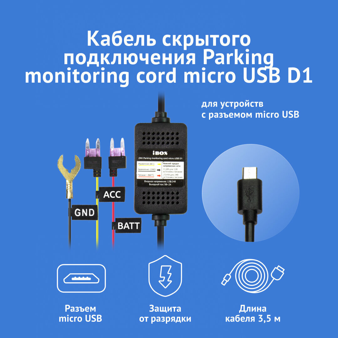 10 цен на Кабель iBOX 24H Parking monitoring cord micro USB D1 для подключения питания 12/24В для видеорегистраторов iBOX