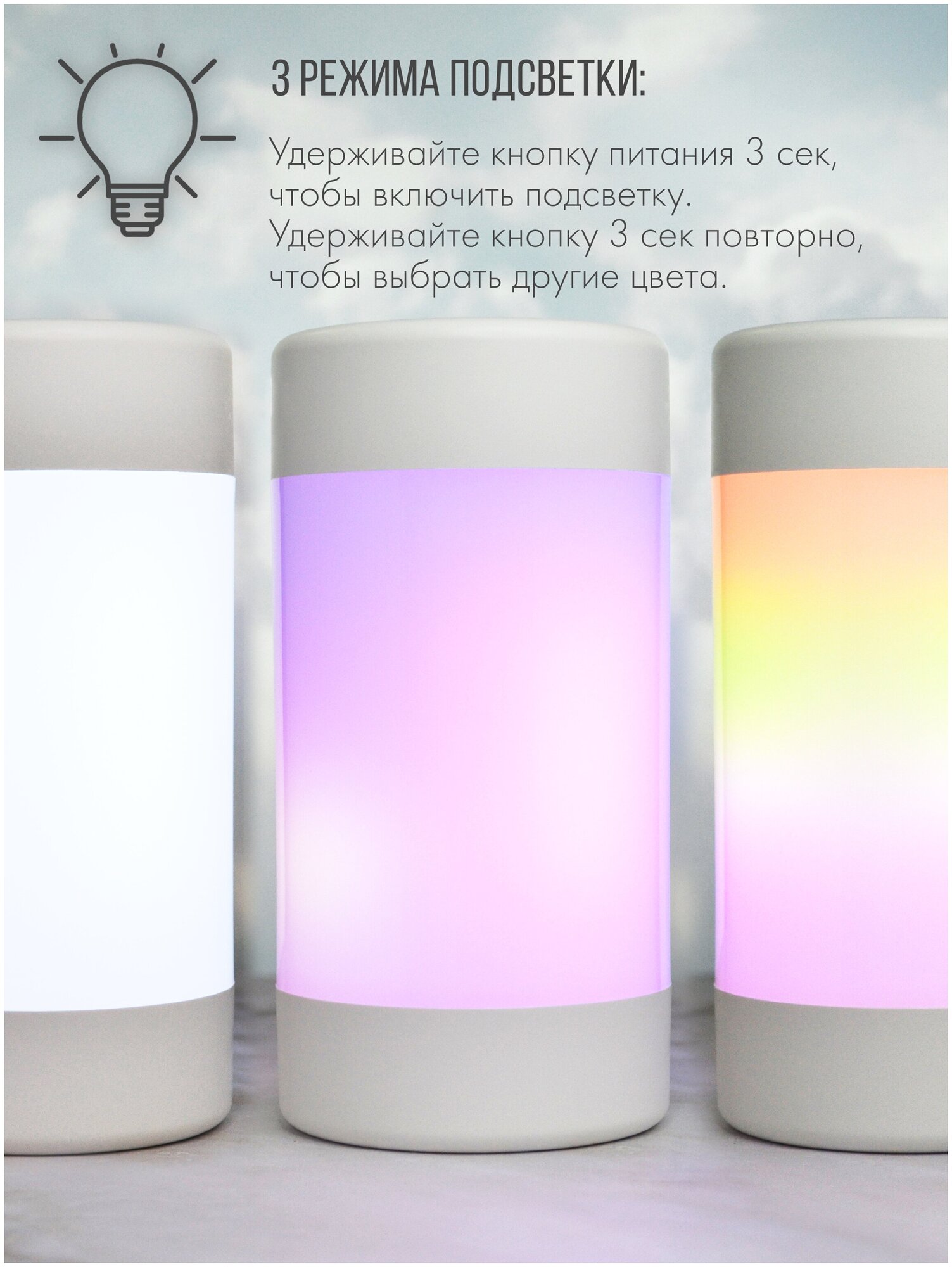 | Дополнительная информация | Удерживайте кнопку питания 3-5 секунд, чтобы включить подсветку. Используйте только дистиллированную, фильтрованную или бутилированную воду без примесей. Не используйте водопроводную воду во избежание быстрого засорения увлажнителя. |