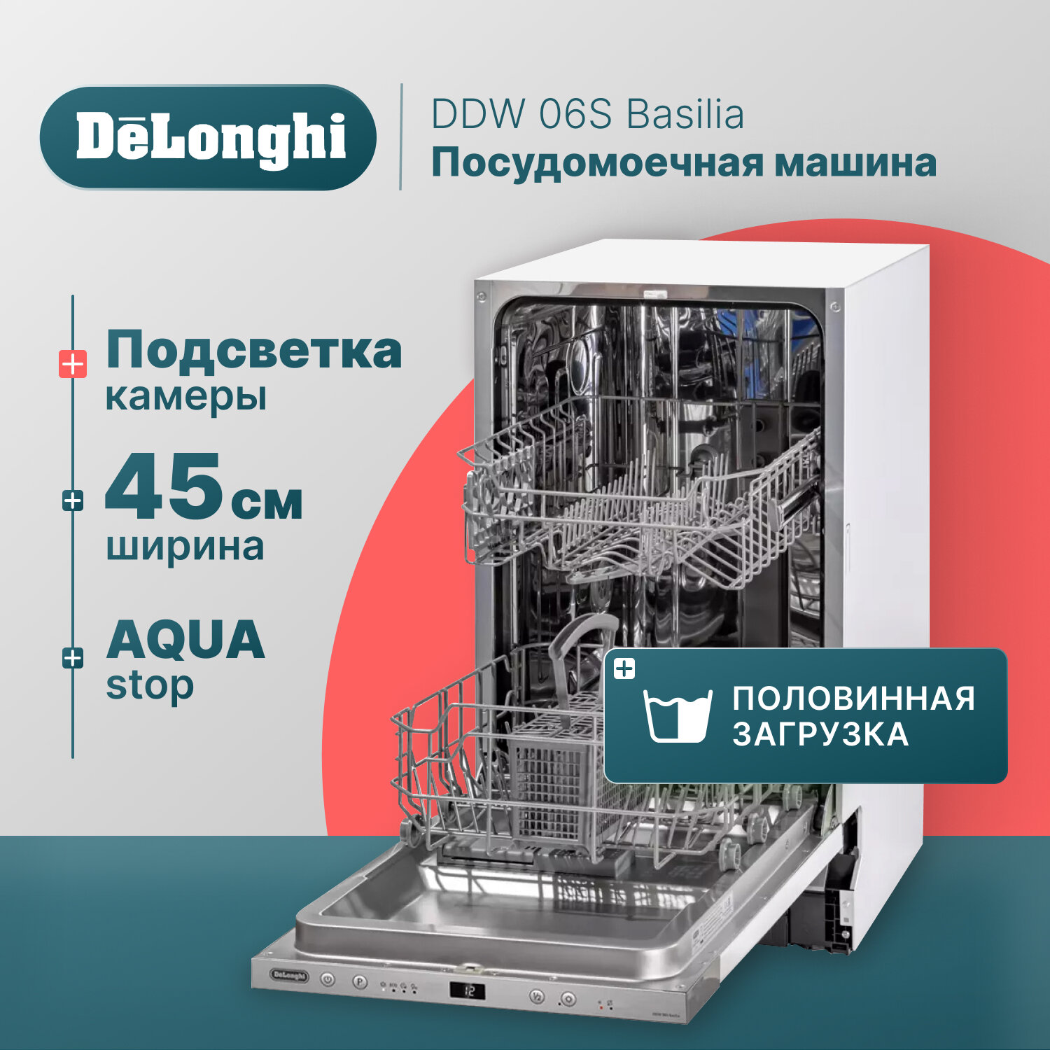 Узкая встраиваемая посудомоечная машина для кухни DeLonghi DDW 06S Basilia, 45 см, с 4 автоматическими программами, вместимостью до 9 наборов посуды, защитой от протечек и перегрева, серебристая 40 970 ₽