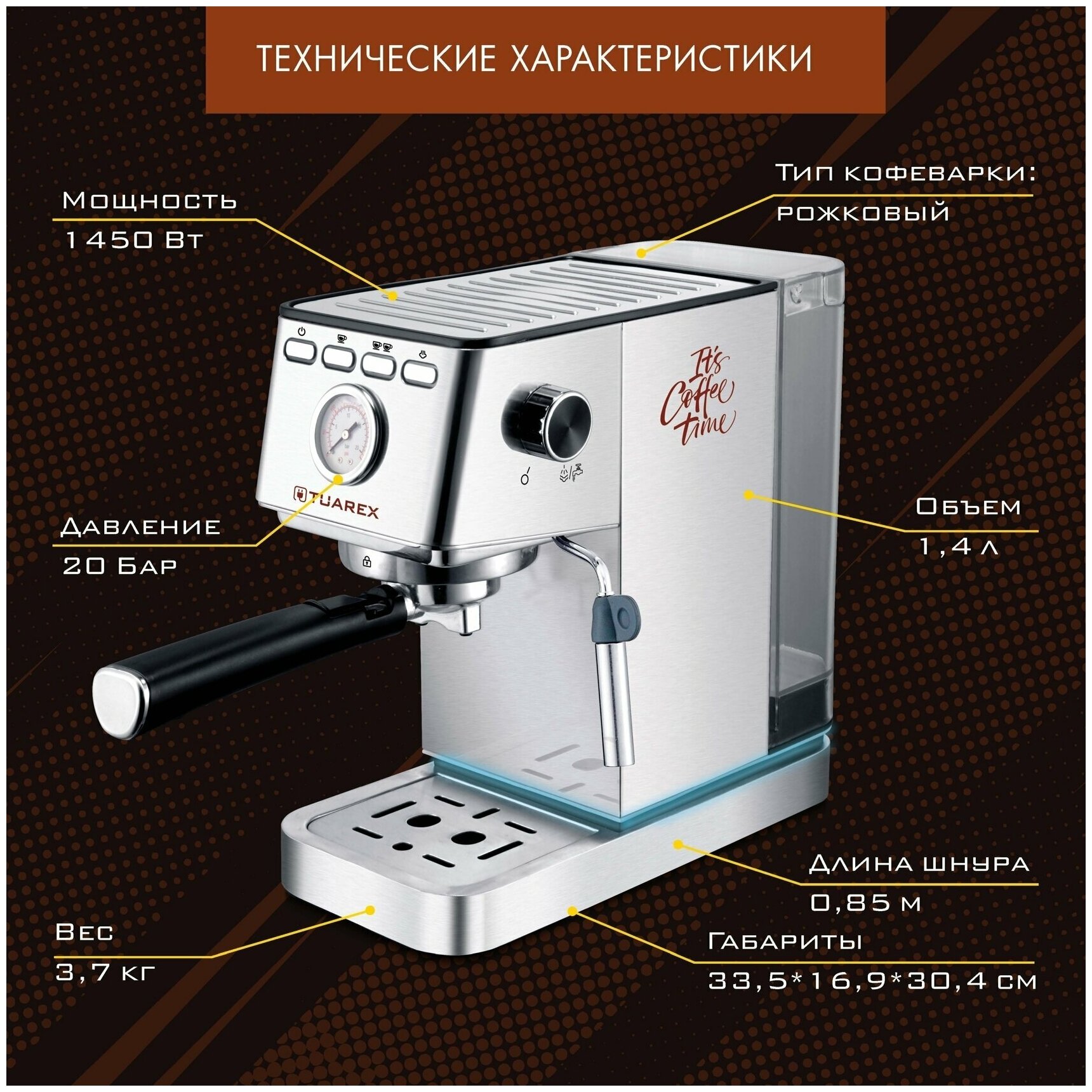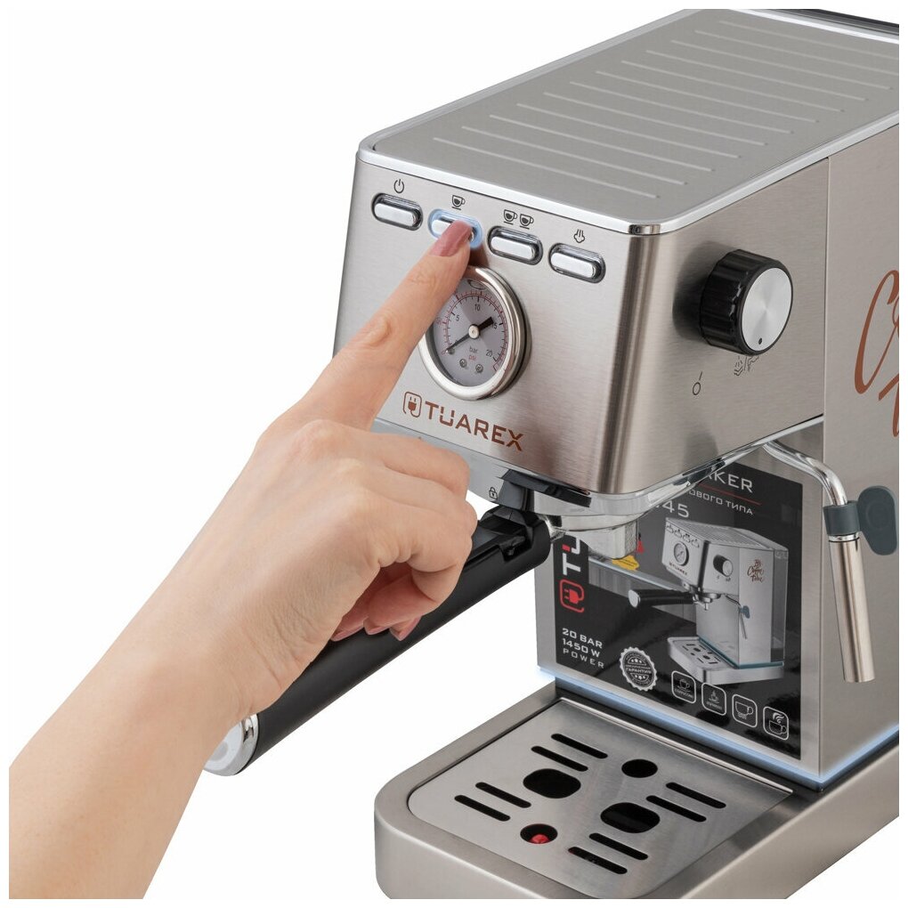 10 цен на Кофеварка рожковая электрическаяTuarex Tk-1245, объем-1.4л, материал- нержавеющая сталь, мощность:14
