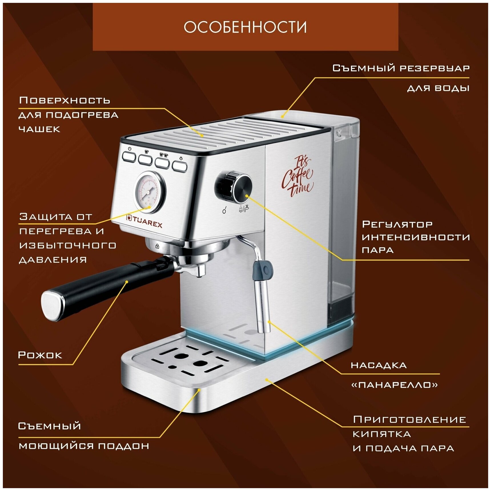 Отзывы на Кофеварка рожковая электрическаяTuarex Tk-1245, объем-1.4л, материал- нержавеющая сталь, мощность:14