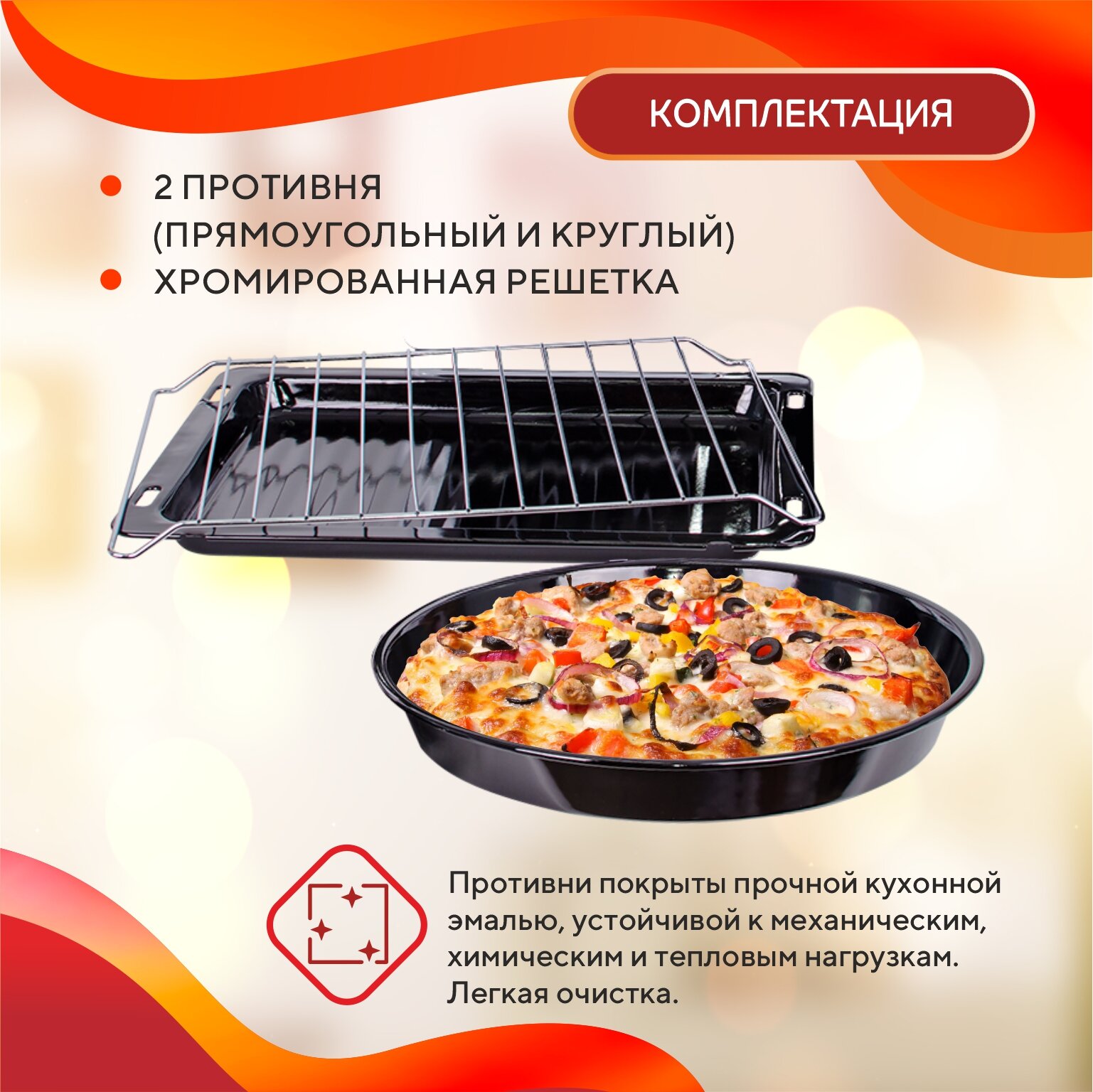 | Комплектация | круглый противень / противень / решётка |