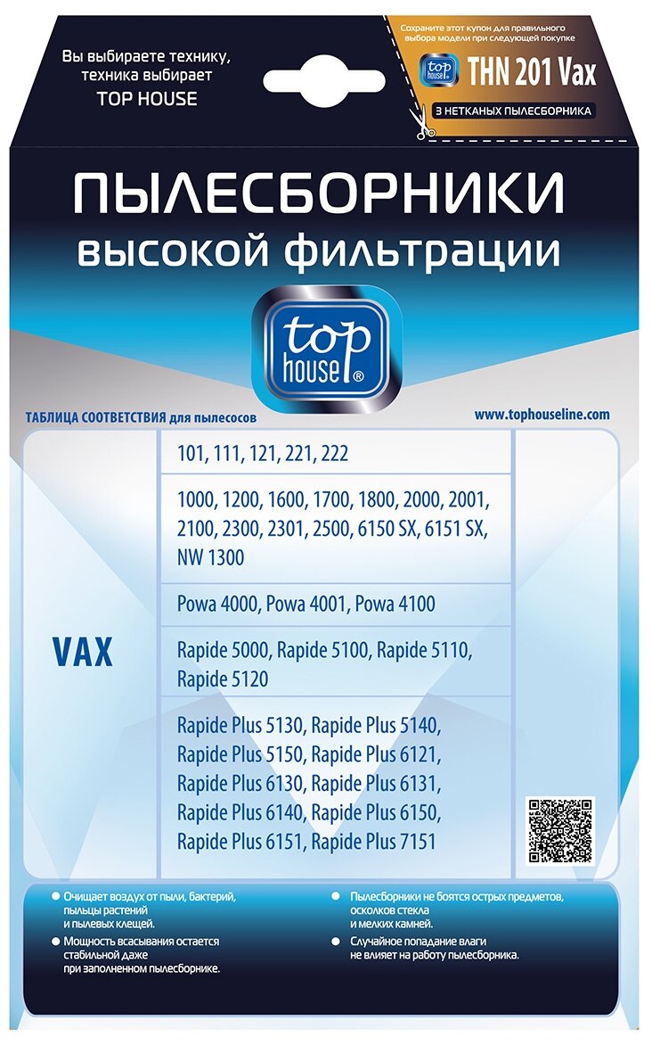 TOP HOUSE THN 201 Vax Мешки-пылесборники из нетканых материалов с высоким уровнем фильтрации, 3 шт. информация: