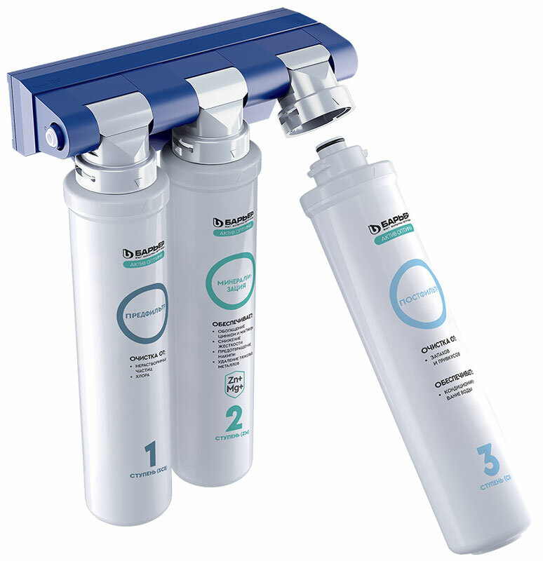 Фильтр под мойку для очистки воды трехступенчатый, быстросъемный БАРЬЕР Актив Оптима Сила Иммунитета, обогащает цинком