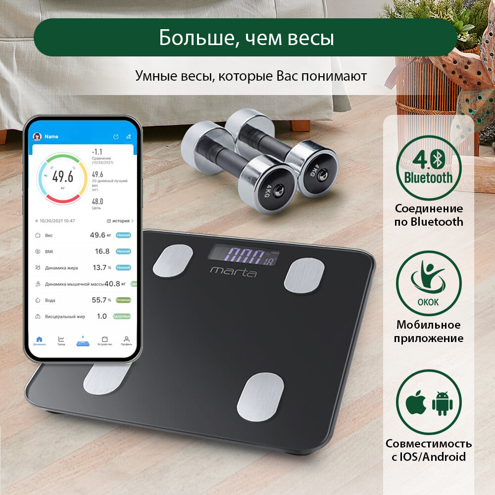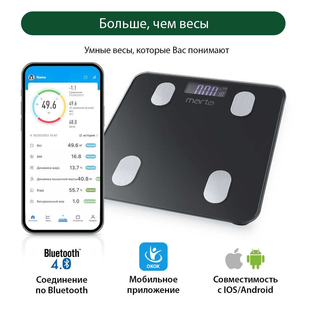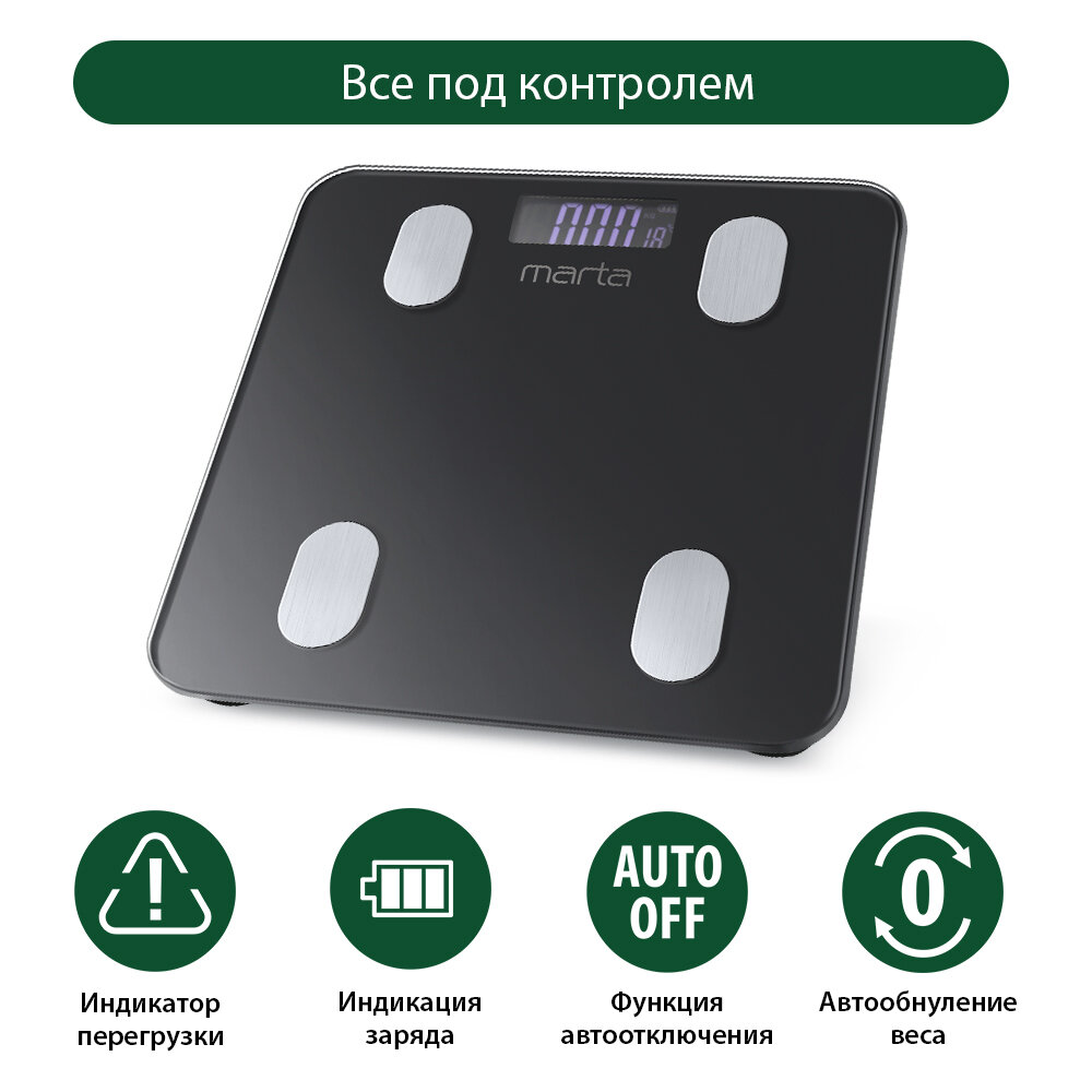 Весы напольные MARTA MT-1683 черный жемчуг LCD диагностические, умные с Bluetooth