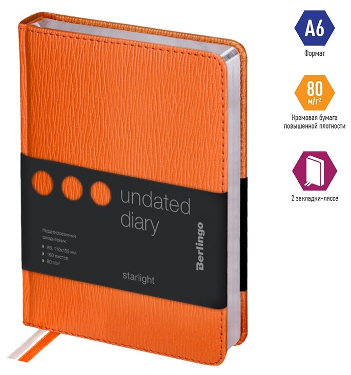 10 цен на Ежедневник недатир. A6, 160л., кожзам, Berlingo "Starlight", серебр. срез, оранжевый