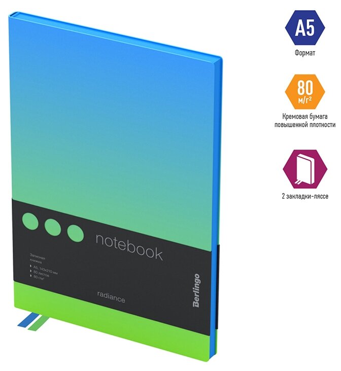 Записная книжка А5 Berlingo "Radiance", 80 листов, клетка, кожзам, черный срез, голубой/зеленый градиент (NB0_93503) информация: