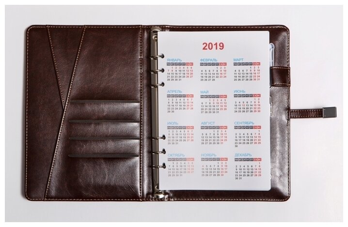 | Особенности | календарь / справочная информация / держатель для ручки / прошивка по периметру обложки / карман для визиток / закругленные углы |