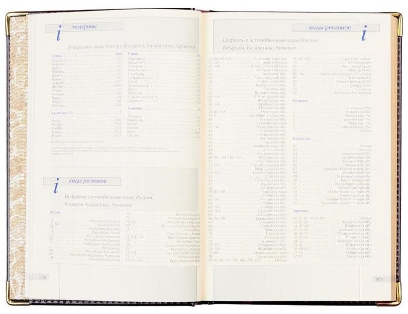 | Особенности | металлические уголки на обложке / справочная информация / ляссе / прошивка по периметру обложки / цветной обрез |