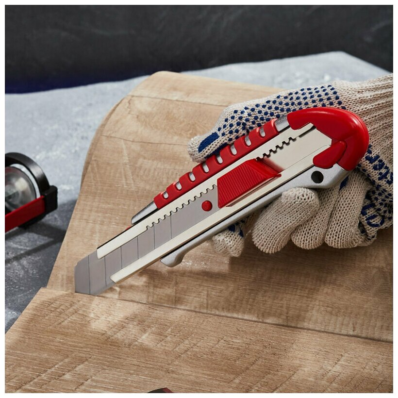 Отзывы на Нож с сегментированным лезвием 25 мм, металлический обрезиненный корпус, с дополнительным замком на лезвии REXANT