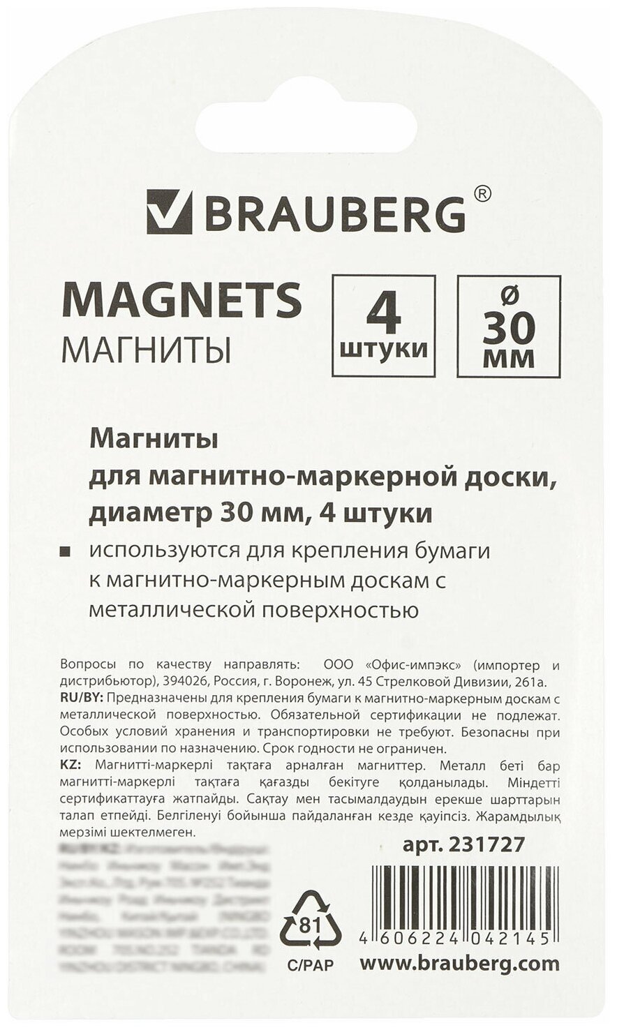 Brauberg Магниты диаметр 30 мм, 4 шт., смайлики, 231727