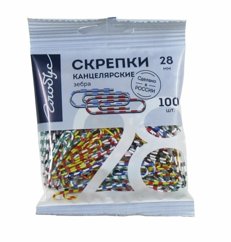 Скрепки Globus Зебра цветные металлические с полимерным покрытием 28 мм (100 штук в упаковке), 1384144 281 ₽