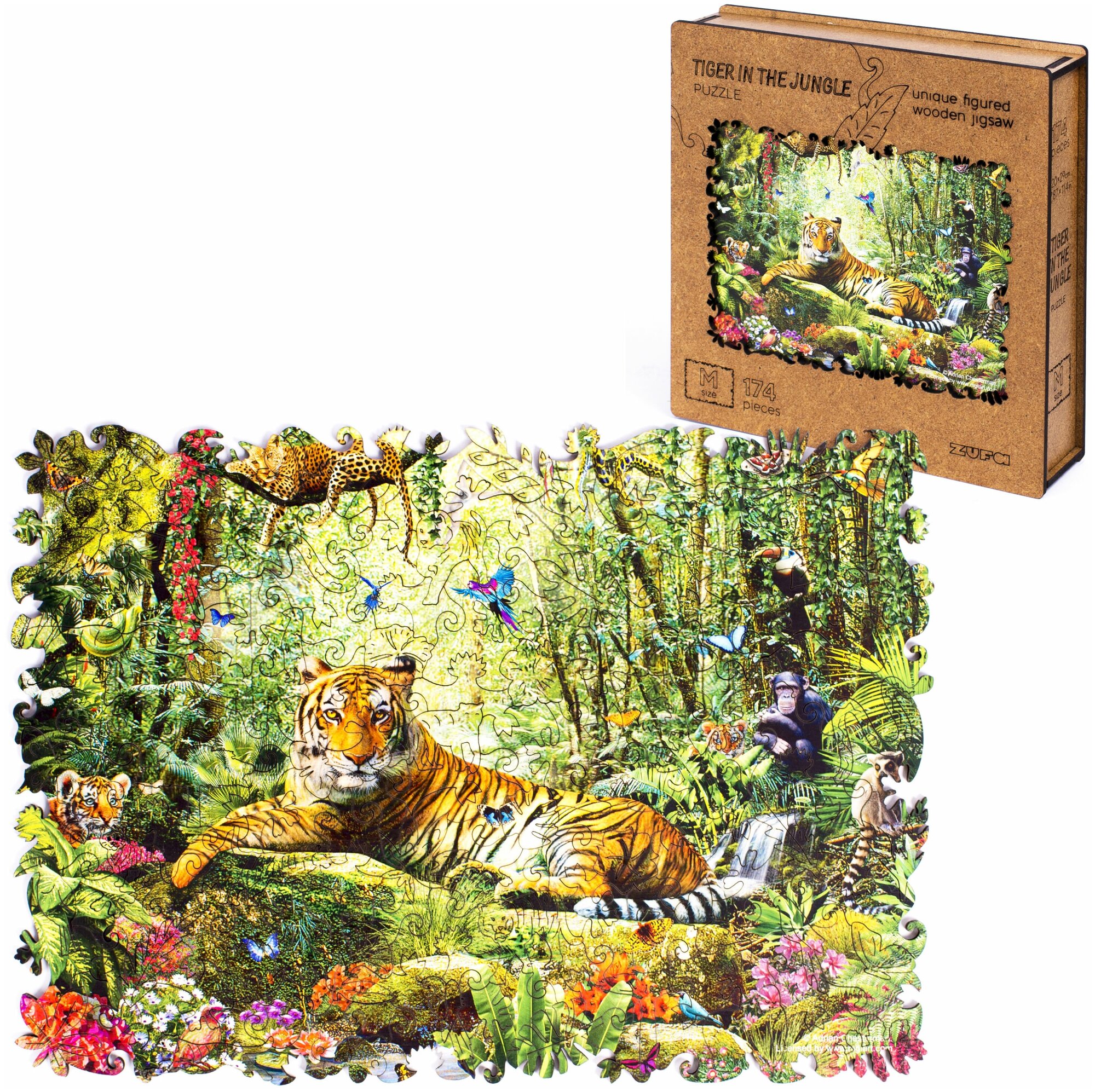 Деревянные пазлы для взрослых и детей Zufa / Фигурные пазлы / Развивающие игрушки / Тигр в джунглях М 174 деталей 29х20 см. информация: