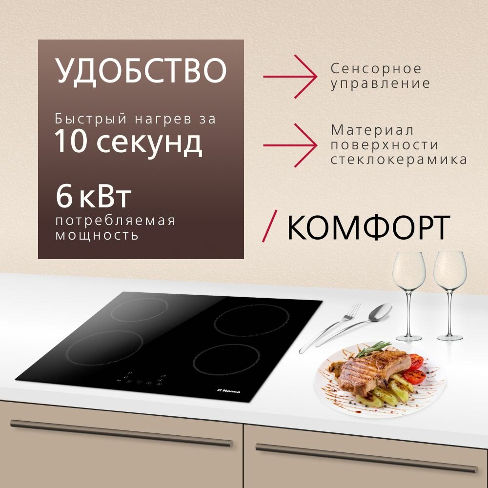 Электрическая варочная панель Hansa BHC633005, стеклокерамическая поверхность, блокировка от детей, таймер, автоотключение, индикация остаточного тепла, черная 18 890 ₽