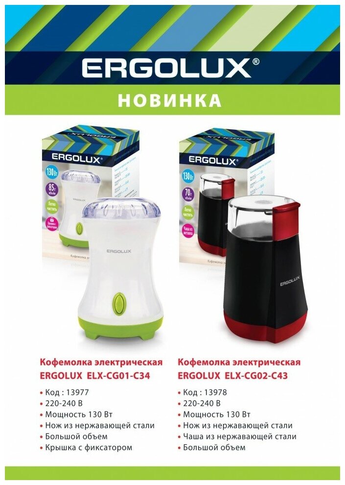 ELX-CG01-C34 бело-салатовая (электрическая кофемолка130 Вт, 220-240 В,85 гр,), ERGOLUX 13977 (1 шт.)