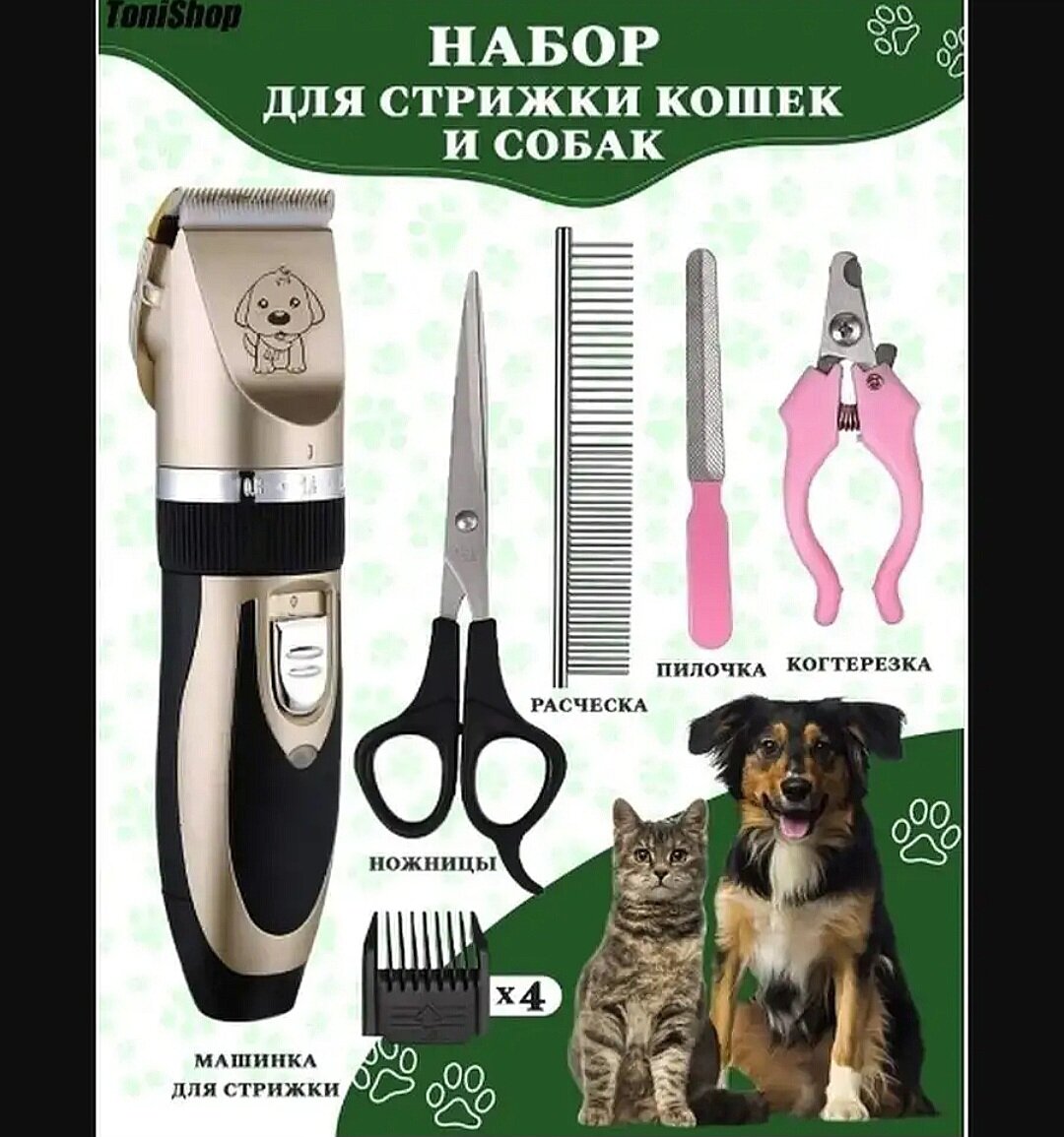 | В комплекте | Кисточка - 1шт.; Когтерезка - 1 шт.; Машинка для стрижки животных - 1 шт.; Насадки для машинки - 4шт.; Ножницы для животных - 1 шт.; Пилка для когтей животных - 1 штука; металлическая расчестка для животных -1шт |