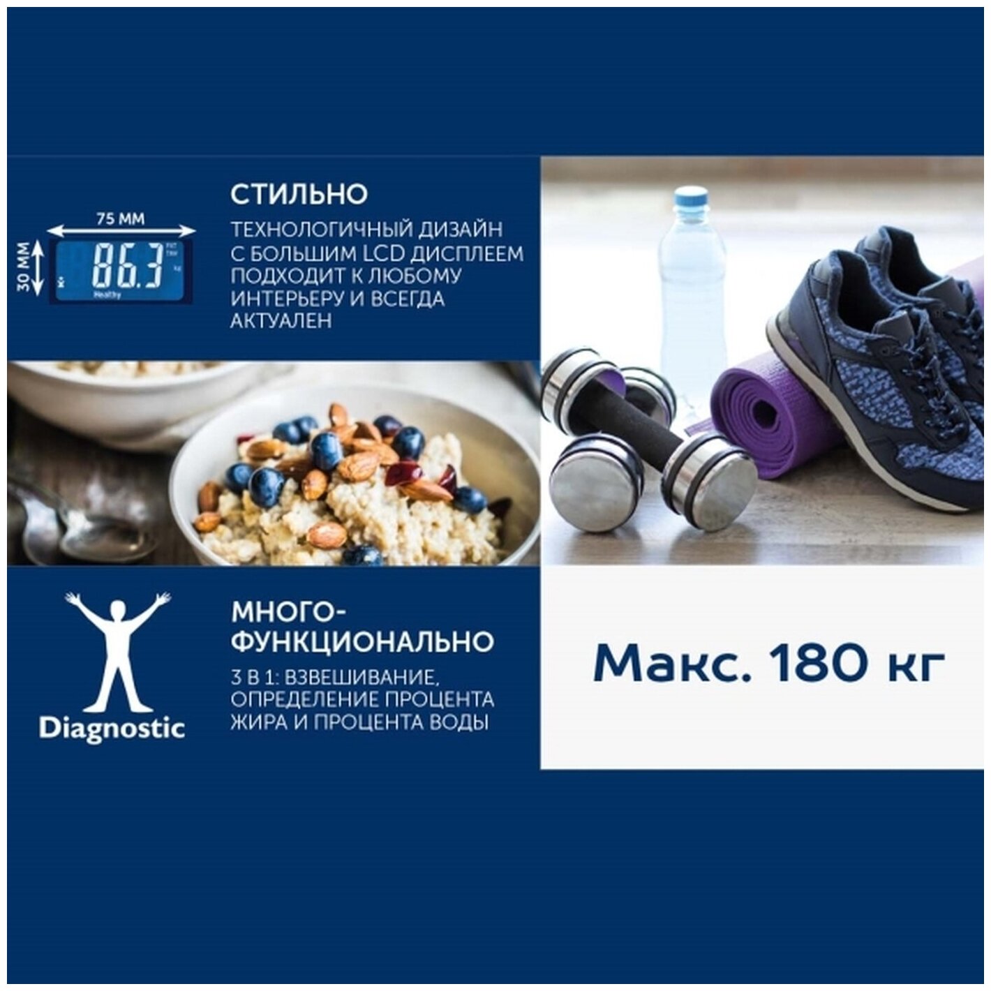| Дополнительные функции | определение доли жировой ткани / определение доли мышечной ткани / определение доли воды / определение доли костной ткани / расчет ИМТ (BMI) / память |