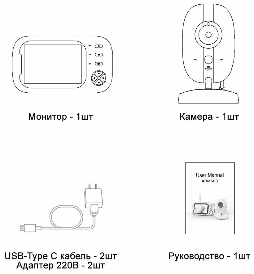 | Подробная комплектация | Камера - видеоняня, беспроводное родительское устройство, 2 зарядных устройства, инструкция |